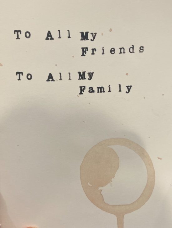 Emboldened by the incredible responses I received from the creative writing students I was put in contact with, I decided to dip into my existing pool of writer friends and ask whether they had any interest in contributing too—and I was met with an enthusiastic yes from all of them. THUS, after years of pushing this shapeless project around like mushy peas on a dinner plate, the final form of To All My Friends, To All My Family was born (with the help of my friends and family, of course).